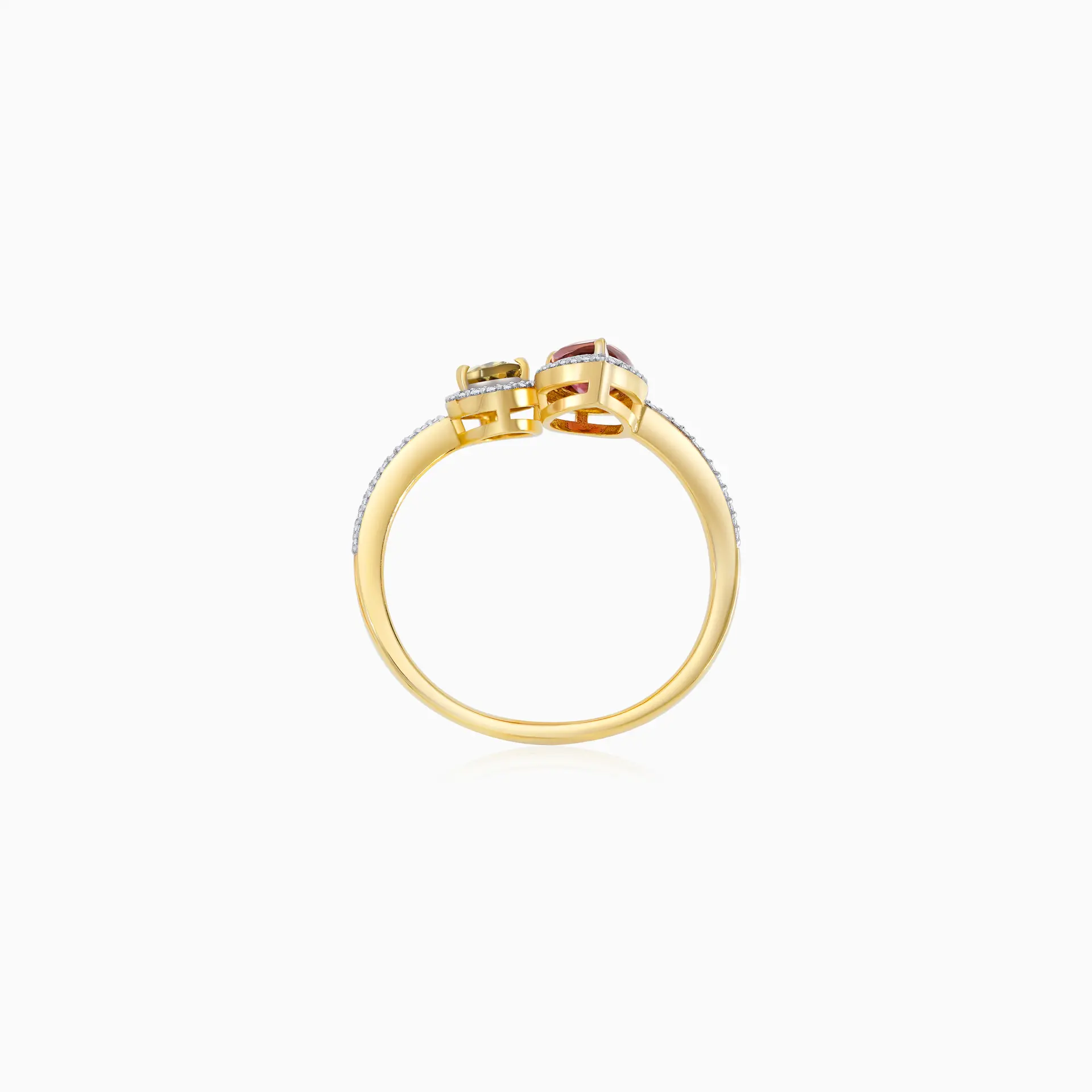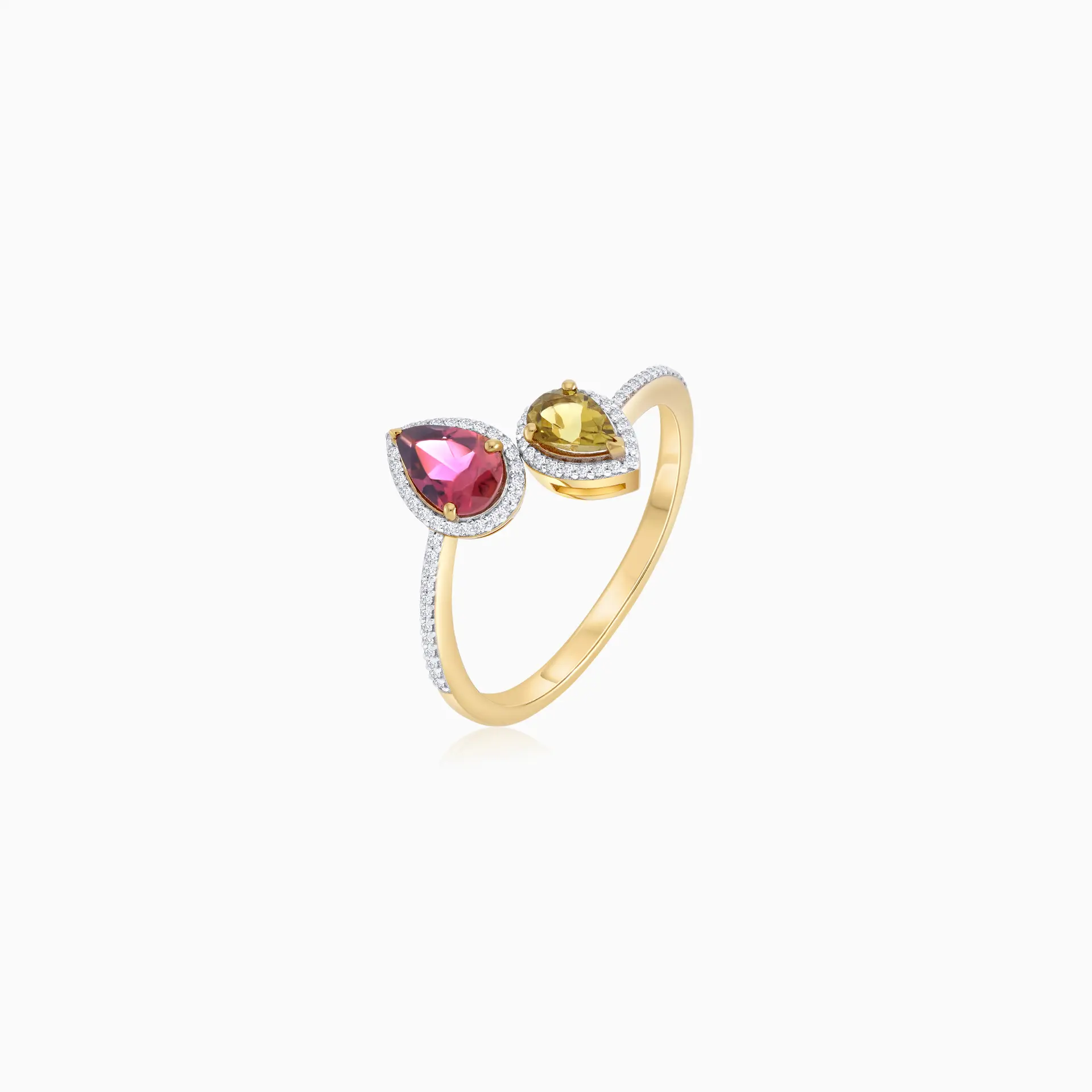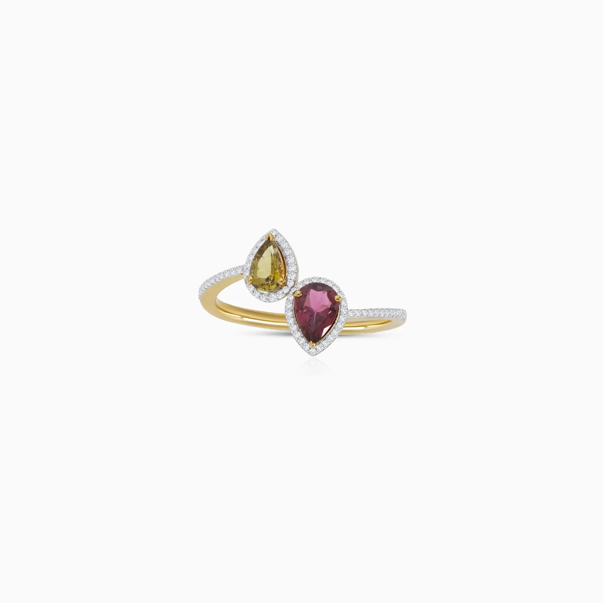 Elevate your jewellery collection with this exquisite 18K yellow gold open ring, showcasing vibrant tourmaline gemstones accented by natural sparkling diamonds. Expertly crafted from pure 18-karat gold, the design combines the vivid allure of tourmaline with the timeless brilliance of diamonds, creating a luxurious statement piece.