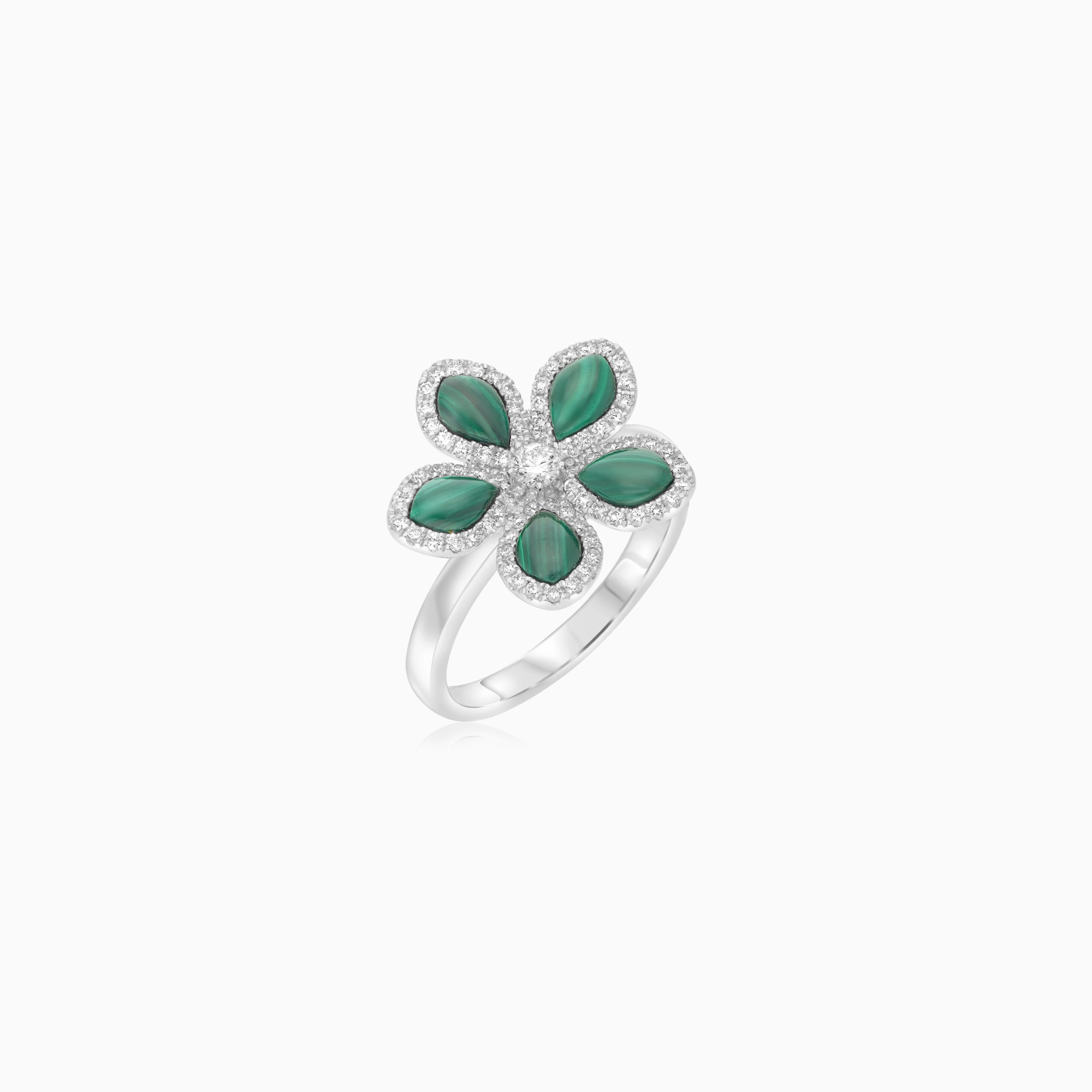 This exquisite 18K white gold ring from the Mosaic Collection showcases a captivating flower design, adorned with round brilliant-cut natural diamonds and vibrant malachite stones. The striking contrast between the deep green malachite and the sparkling diamonds enhances its elegance and sophistication.